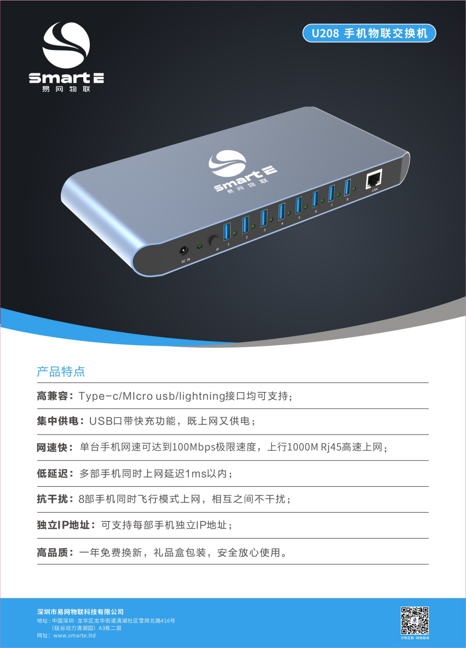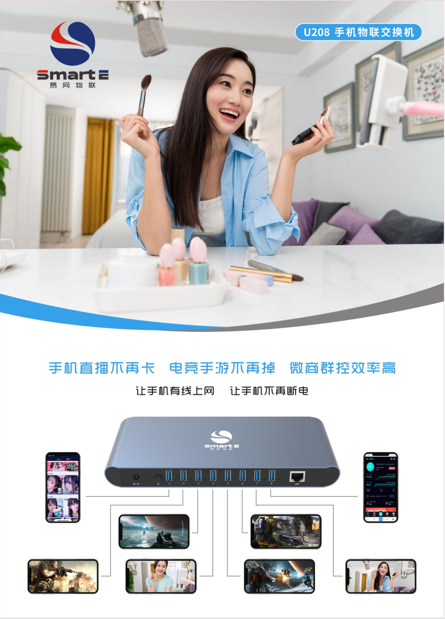 U208是易網(wǎng)物聯(lián)(SmartE)專門為手機直播、電競手游、微商群控群體打造的一款手機有線上網(wǎng)產(chǎn)品。內(nèi)置高性能USB芯片,同時支持市面主流的Type-c/Micro usb/lightning手機接口。支持手機快充,既能滿足手機上網(wǎng),又能給手機供電,非常適合長時間工作的直播、手游、群控等用戶場景。